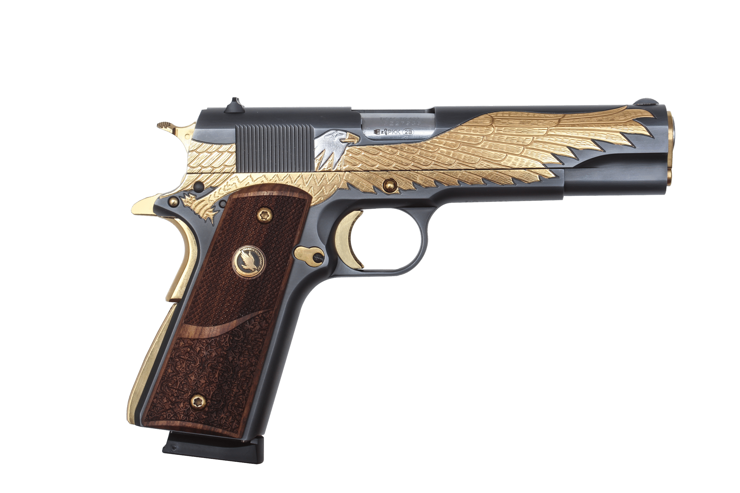 Classic 1911 pistol in cal. .45ACP (M1911) or 9x19mm (M1) barrel length 5“ (127mm), version with dust cover. Ambidextrous thumb safety and Grip Safety. The pistol has special engravings like „golden eagle“ and small parts coated in PVD Gold. Main color is grey. All parts are made of hammerforged steel, no MIM Parts. Wooden, screwed grip panels. The barrel design is classic with bushing. Included in delivery are Gun case, Manual, 2 magazines 8rds (9rds for 9x19mm) as well as 1x Fluna Gun Coating 10ml and 1x Fluna Gun Degreaser.