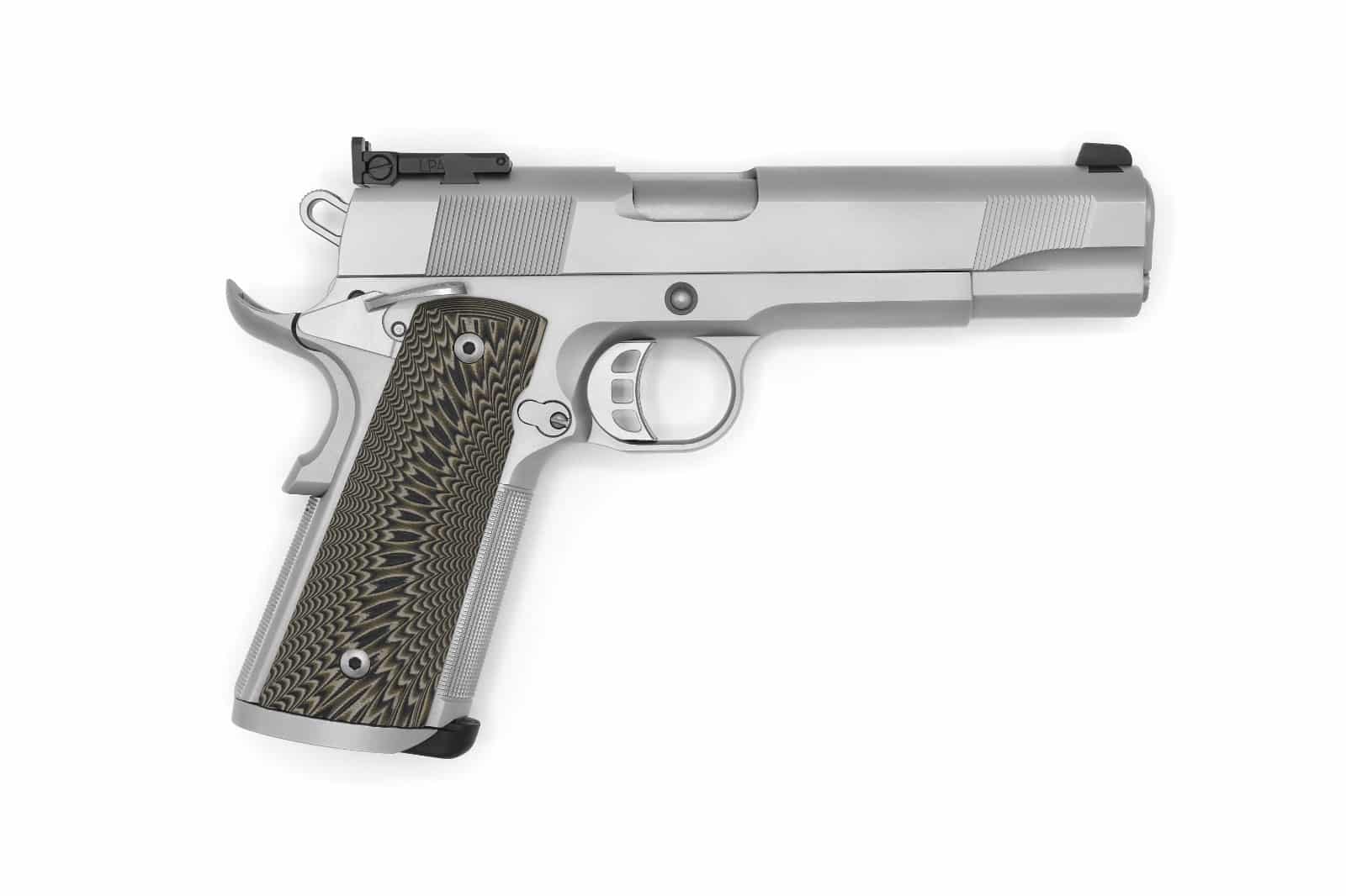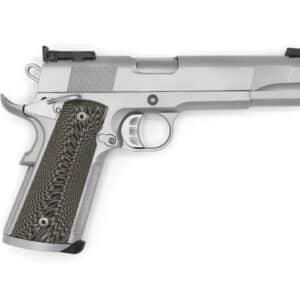 Classic 1911 pistol in cal. .45ACP (M1911) or 9x19mm (M1) as a match pistol. Barrel length 5″ (127mm), version with dust cover. Ambidextrous thumb safety and Grip safety. The pistol is completely made of stainless steel. Tight tolerances, checkering on the frame, extended magazine release button, stainless magwell, a stainless match barrel, adjustable trigger and adjustable LPA match sights characterize this model. Screwed grip panels in G10. 25 LPI Checkering on front- und backside of frame. The barrel design is classic with bushing. Included in delivery are gun case, operating instructions, 2 magazines 8rds (9rds for 9x19mm) as well as 1x Fluna Gun Coating 10ml and 1x Fluna Gun Degreaser.