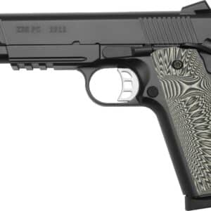 Classic 1911 pistol in cal. .45ACP (M1911) or 9x19mm (M1) barrel lengths 5“ (127mm) or 4.25” (109mm), version with Picatinny Rail underneath the Barrel. Ambidextrous thumb safety and Grip Safety. The pistol is available in Stainless- or Carbon Steel, coated with Cerakote Black. All parts are made of hammerforged steel, no MIM Parts. Screwed grip panels in G10. The barrel design is classic with bushing. Included in delivery are :  Gun case, Manual, 2 magazines 8rds (9rds for 9x19mm) as well as 1x Fluna Gun Coating 10ml and 1x Fluna Gun Degreaser.